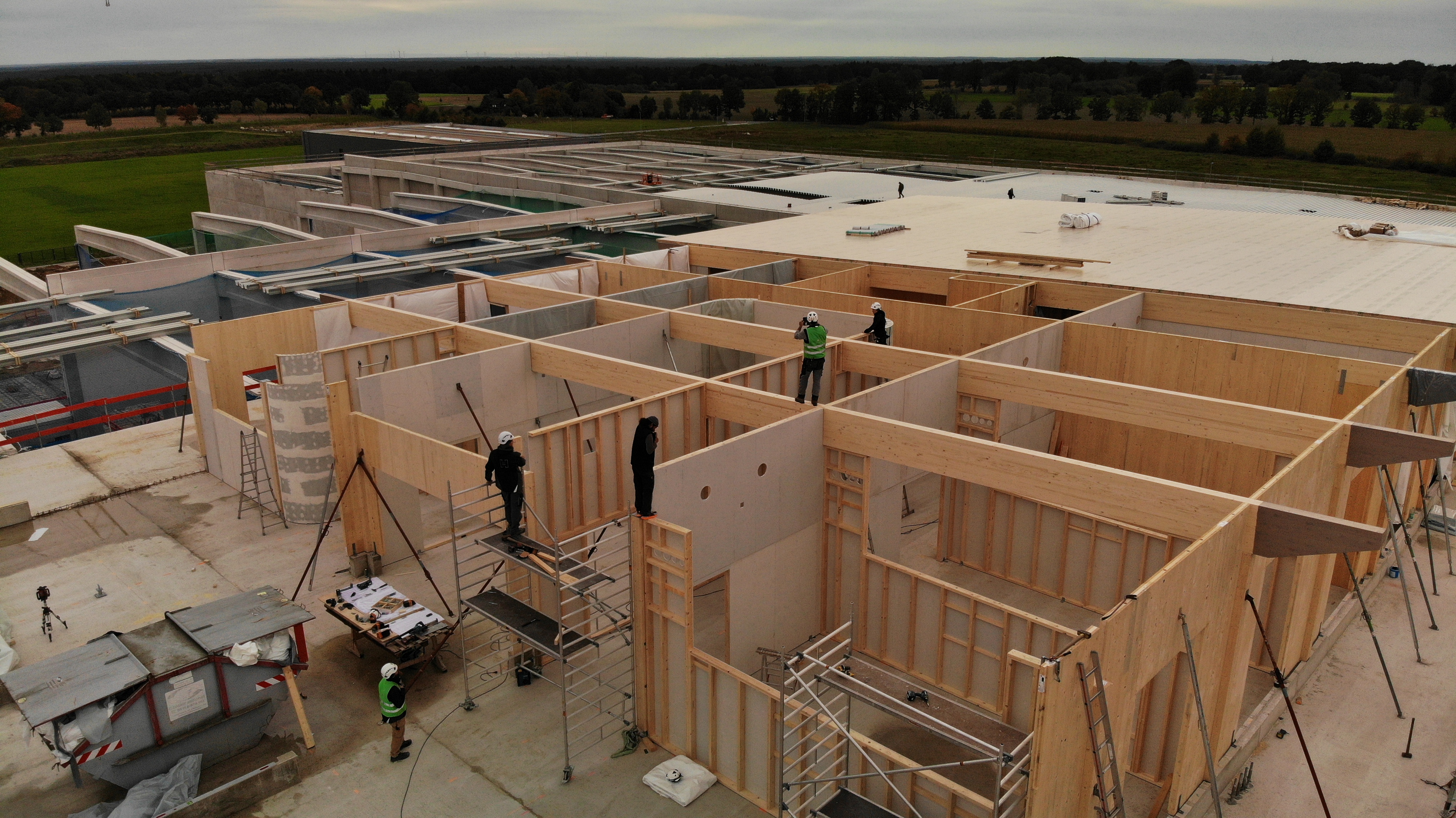 Wir durften in Kooperation mit der Firma Freisinger Fensterbau beim Bau des neuen Logistikzentrums in Walsrode unser Know-how im modernen Holzbau einbringen. Unser Beitrag umfasste die Fertigung und Montage von ca. 850 m² Außenwänden aus CLT in Sichtqualität, inklusive Dämmung und Holzfassade. Zudem errichteten wir ein Dach mit ca. 2.500 m² CLT in Sichtqualität sowie ca. 1.500 m² Innenwände in Riegelbauweise, beidseitig mit Fermacell beplankt. Die Freisinger Fensterbau übernahm die Lieferung und Montage von Fenstern, Türen, Sonnenschutz, Fensterbänken und Brandschutztüren an der Außenhülle. Dank der engen Zusammenarbeit zwischen Holzbau und Fensterbau konnten die Schnittstellenoptimal abgestimmt und der Bau effizient umgesetzt werden. So profitiert der Bauherr von einer reibungslosen und zügigen Bauabwicklung.